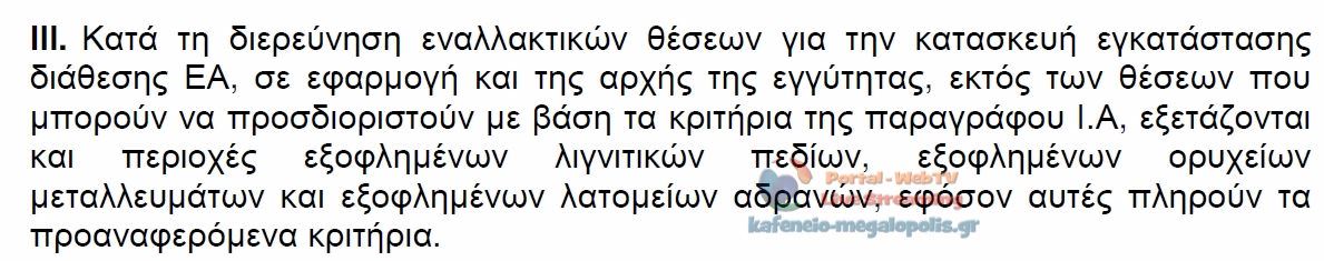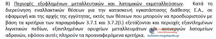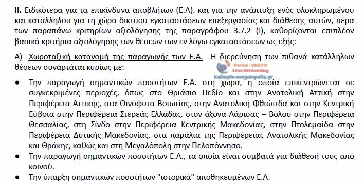 Συγκεκριμένα μέσα στο Εθνικό Σχέδιο υπάρχουν αναφορές για την Μεγαλόπολη – ανάμεσα και σε άλλες περιοχές – για να δεχθεί Επικίνδυνα Βιομηχανικά Απόβλητα. Επίσης στο σχέδιο γίνονται αναφορές και για περιοχές με εξαντλημένες λατομικές και μεταλλευτικές εγκαταστάσεις και λιγνιτωρυχεία.