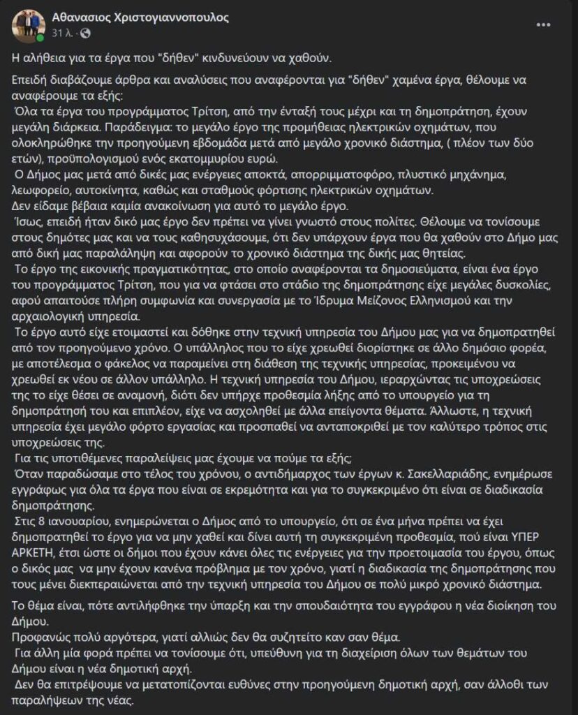 Σε ανάρτηση στο Facebook ο πρώην Δήμαρχος Μεγαλόπολης κ. Χριστογιαννόπουλος αναφέρεται στο θέμα με το έργο του προγράμματος Τρίτση.