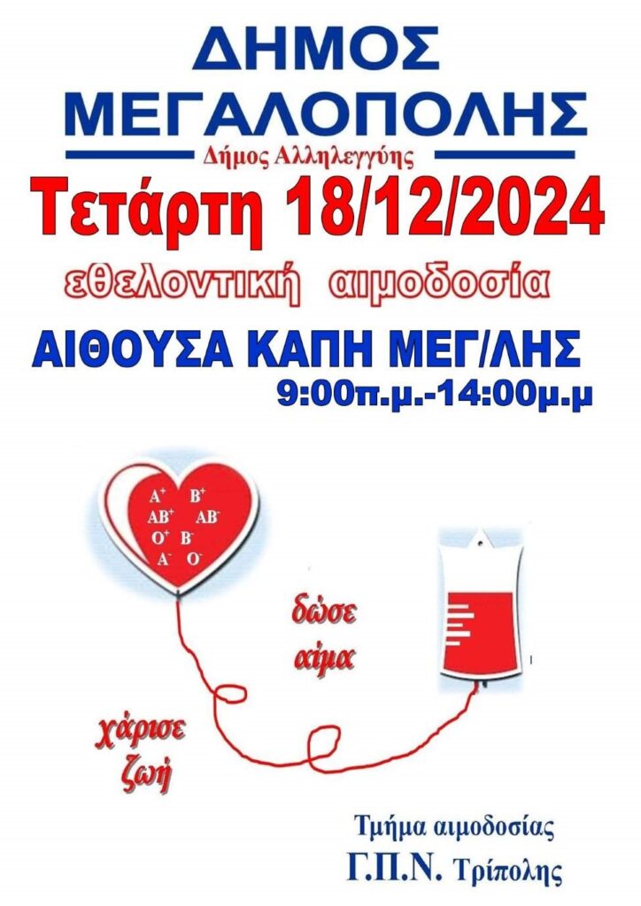 Σας ενημερώνουμε ότι λόγω της Ενεργειακής Αναβάθμισης του Κέντρου Υγείας Μεγαλόπολης, η καθιερωμένη αιμοδοσία του Δήμου μας θα πραγματοποιηθεί την Τετάρτη 18 Δεκεμβρίου από τις 9:00 π.μ έως 14:00 μ.μ. στην αίθουσα του ΚΑΠΗ Μεγαλόπολης.