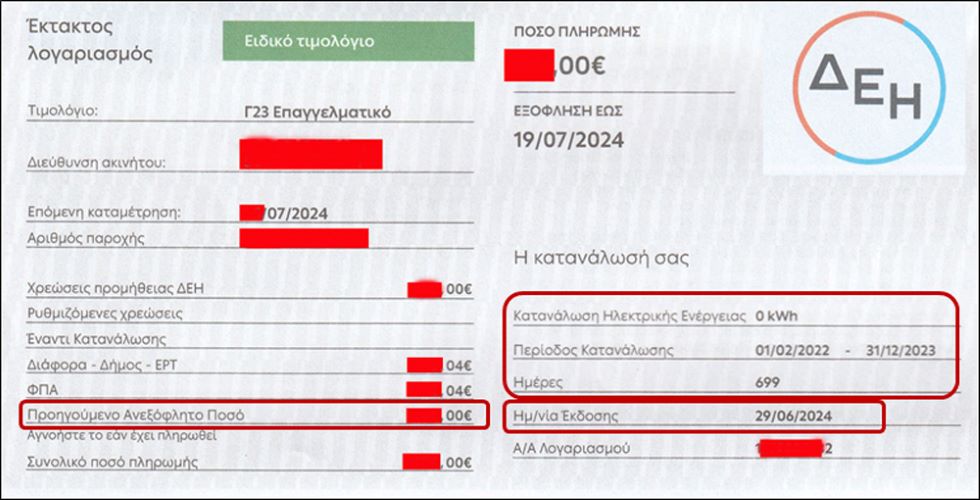 Στην εικόνα βλέπουμε απόσπασμα ενός απ’ τους επίμαχους λογαριασμούς, με πάροχο τη ΔΕΗ (έχουν σβηστεί τα στοιχεία αναγνώρισης). Σε λογαριασμό που εκδόθηκε στις 29/6, η «καλή μας» ΔΕΗ φρόντισε να συμπεριλάβει ως «ανεξόφλητο» το ποσό του προηγούμενου λογαριασμού. Μόνο που στις 29/6 ο λογαριασμός ήθελε ακόμα πάνω από 10 ημέρες για να λήξει και προφανώς δεν ήταν ληξιπρόθεσμος. Με τον τρόπο αυτό το ποσό πληρωμής υπερδιπλασιάζεται κι αν δεν προσέξει κανείς, πληρώνει δυο φορές τον ίδιο λογαριασμό! Είδες η ΔΕΗ;