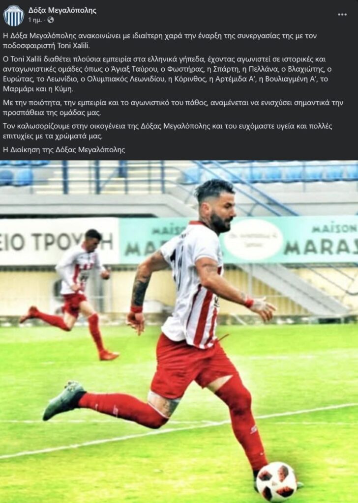 Η Δόξα Μεγαλόπολης ανακοινώνει με ιδιαίτερη χαρά την έναρξη της συνεργασίας της με τον ποδοσφαιριστή Toni Xalili. Ο Toni Xalili διαθέτει πλούσια εμπειρία στα ελληνικά γήπεδα, έχοντας αγωνιστεί σε ιστορικές και ανταγωνιστικές ομάδες όπως ο Άγιαξ Ταύρου, ο Φωστήρας, η Σπάρτη, η Πελλάνα, ο Βλαχιώτης, ο Ευρώτας, το Λεωνίδιο, ο Ολυμπιακός Λεωνιδίου, η Κόρινθος, η Αρτέμιδα Α’, η Βουλιαγμένη Α’, το Μαρμάρι και η Κύμη.