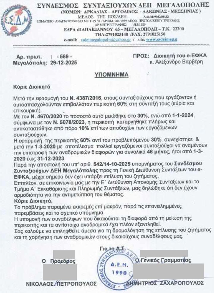 Ο Σύνδεσμος Συνταξιούχων ΔΕΗ Μεγαλόπολης μας προώθησε υπόμνημα που συνέταξε τον περασμένο μήνα και δρομολόγησε προς τον Διοικητή του ΕΦΚΑ, όπου μας γνωστοποιεί την ανησυχία και την αγανάκτησή των συνταξιούχων που εκπροσωπεί, οι οποίοι συμβαίνει να εργάζονται, όντας συνταξιούχοι, για την εισέτι μη καταβολή των αναδρομικών που τους οφείλονται, λόγω της εκ των υστέρων ψηφισθείσας θεσμικής πρόβλεψης για ελάττωση του ποσοστού παρακράτησης στις αποδοχές τους, από 1/3/2020 και εξής, με τη σχετική χρονική περίοδο αναφοράς αυτών των αναδρομικών να εκτείνεται μέχρι την 31/12/2023. Μας τονίστηκε ότι, έκκληση για την καταβολή αυτών των αναδρομικών είχε διατυπωθεί και στο από 14/10/2025 υπόμνημα του ως άνω Συνδέσμου προς τον Διοικητή του ΕΦΚΑ, χωρίς όμως να προκύψει οποιαδήποτε θετική προς το αίτημα αυτό εξέλιξη. Κατόπιν επικοινωνίας τους μαζί μας, οι εκπρόσωποι του ανωτέρω Συνδέσμου μας ζήτησαν να διαμεσολαβήσουμε ενώπιόν σας, διαβιβάζοντας προς το μέρος σας το αίτημα για λήψη των απαραίτητων πολιτικών πρωτοβουλιών, προκειμένου να καταβληθούν στους ως άνω εργαζόμενους συνταξιούχους τα ποσά που δικαιούνται να λάβουν αναδρομικά για την περίοδο από 1/3/2020 ως 31/12/2023, λόγω της εκ των υστέρων ψηφισθείσας θεσμικής πρόβλεψης ελάττωσης του ποσοστού περικοπής των εισπραττόμενων συντάξεών τους, δια του Ν.4670/2020, ο οποίος ψηφίσθηκε λίγο μετά την αρχή της προαναφερθείσας περιόδου. Με δεδομένα όλα τα παραπάνω και αφού λάβετε υπόψη τα αναφερόμενα στο συνημμένο