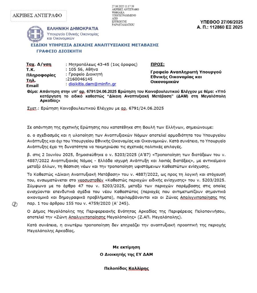Κατά συνέπεια, η ανωτέρω τροποποίηση δεν επηρεάζει την αναπτυξιακή προοπτική της περιοχής Μεγαλόπολης Αρκαδίας.