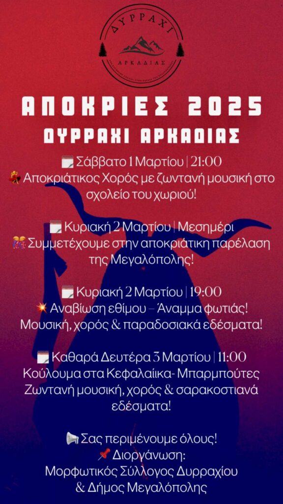 Ο Μορφωτικός Σύλλογος Δυρραχίου διοργανώνει αποκριάτικες εκδηλώσεις σε συνεργασία με τον Δήμο Μεγαλόπολης.