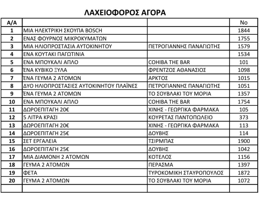 Τα αποτελέσματα της λαχειοφόρου αγοράς που έγινε στο πανηγύρι στην Καρύταινα, την Κυριακή 27 Ιουλίου, εορτή του Αγίου Παντελεήμονος. είναι στον πίνακα που ακολουθεί, όποιος-όποια έχει κερδίσει μπορεί να επικοινωνήσει με το τηλέφωνο 6986647234, κ. Νότης Βλασόγιαννης.