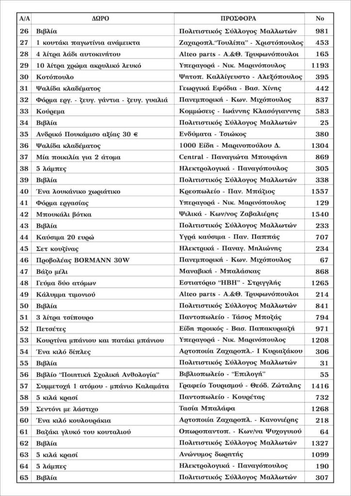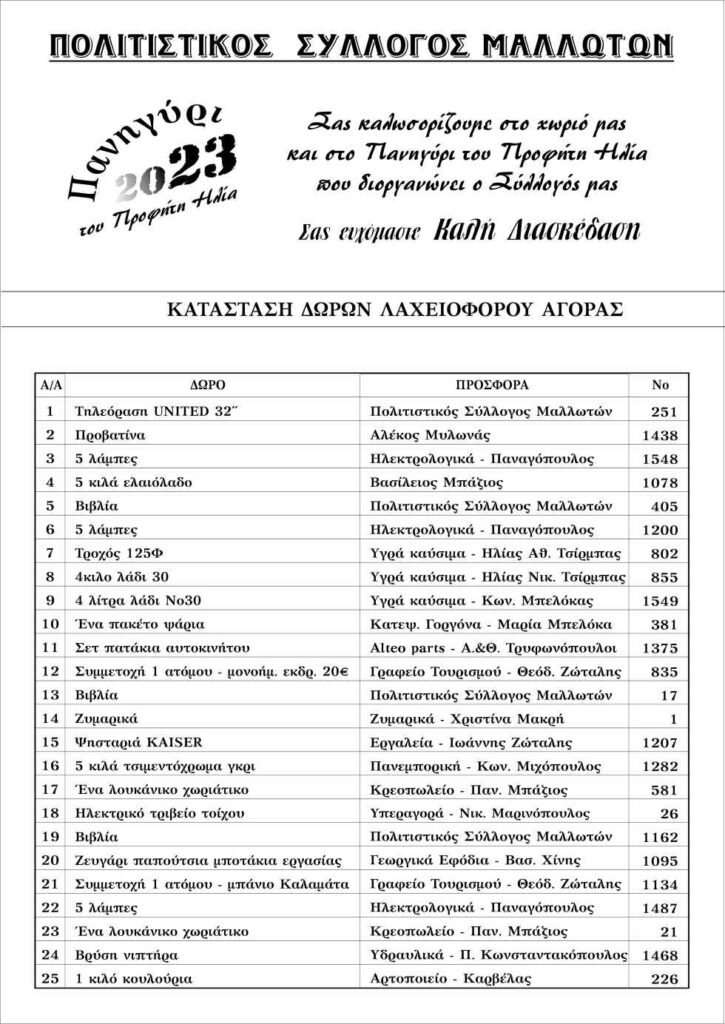 Κατάσταση δώρων λαχειοφόρου αγοράς του Συλλόγου Μαλλωτών στο Πανηγύρι του Προφήτη Ηλία στις 20 Ιουλίου 2023