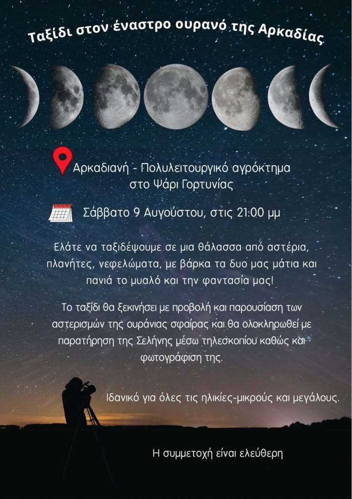 Στις 21:00 μ.μ. θα αφήσουμε τις γεύσεις και θα ταξιδέψουμε με το βλέμμα στον έναστρο ουρανό της Αρκαδίας, μακριά από τα φώτα της πόλης. Μια ευκαιρία να ανακαλύψετε τους αστερισμούς και να ζήσετε κάτι πραγματικά διαφορετικό.
