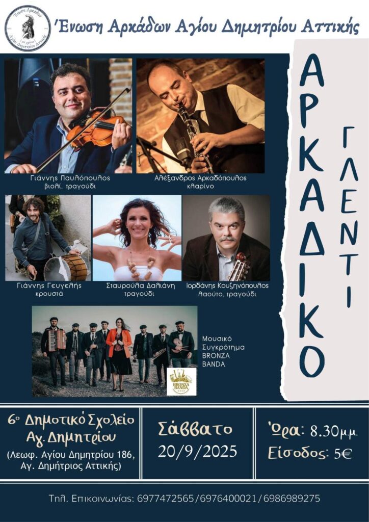 Η Ένωση Αρκάδων Αγίου Δημητρίου διοργανώνει το ΑΡΚΑΔΙΚΟ ΓΛΕΝΤΙ , το Σάββατο 20 Σεπτεμβρίου στο 6ο Δημοτικό Σχολείο Αγίου Δημητρίου.