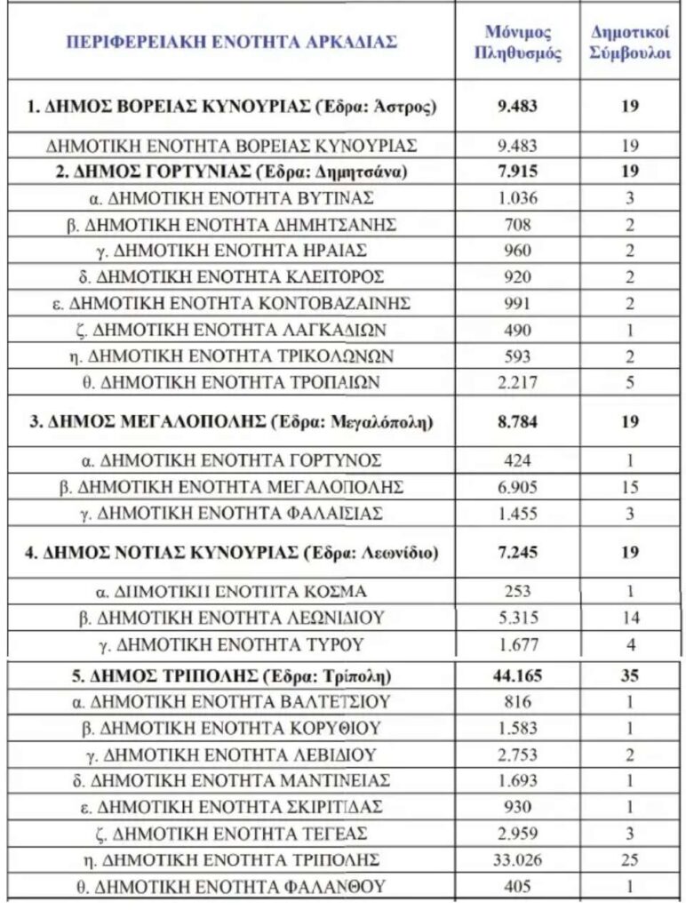 Στους πίνακες παρουσιάζεται ο αριθμός των δημοτικών συμβούλων που εκλέγονται ανά Δήμο στην Αρκαδία.