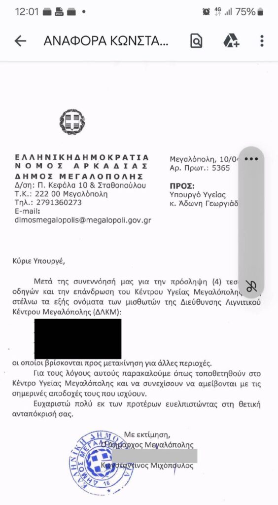 Επεσε στην αντίληψη μας,το γεγονός ότι πριν από λίγο καιρό,αποστείλατε στον Υπουργό Υγείας επιστολή (δημοσιεύεται στο τέλος του δελτίου τύπου) και του ζητήσατε να μεριμνήσει για την ενίσχυση του ΚΥ Μεγαλόπολης με προσωπικό που επρόκειτο να μετακινηθεί ,η αναγκάζονταν σε εθελουσία έξοδο από τη ΔΕΗ.