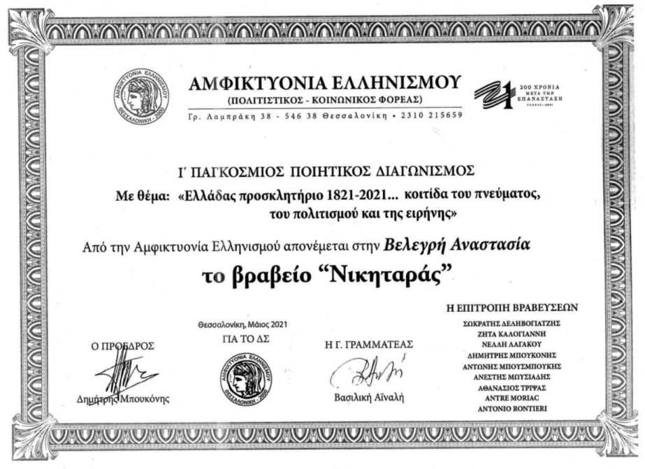 Είχαμε την χαρά να ακούσουμε την απαγγελία του βραβευμένου ποιήματος από την ίδια την δημιουργό στην Εκδήλωση Μνήμης για τον Στρατηγό Νικηταρά που διεξήχθη στις 10 Οκτωβρίου στην Ευαγγελίστρια του Πειραιά.