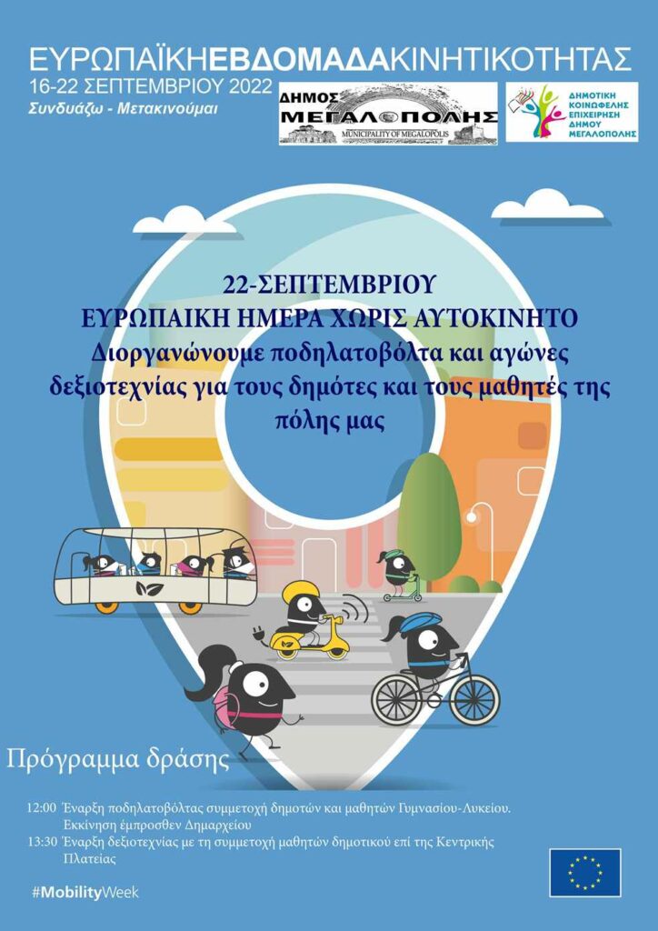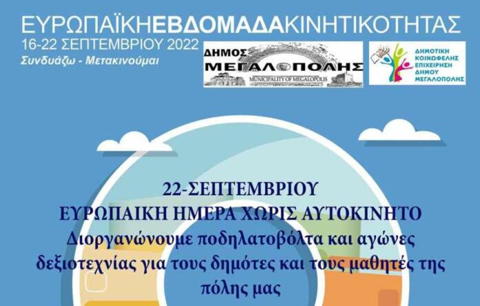 Στα πλαίσια της Ευρωπαϊκής ημέρας χωρίς αυτοκίνητο, ο Δήμος Μεγαλόπολης και  η Δημοτική Κοινωφελής Επιχείρηση του Δήμου Μεγαλόπολης σε συνεργασία με τον Ποδηλατικό Όμιλο Τρίπολης, διοργανώνουν ποδηλατοβόλτα περιμετρικά της πόλης  και κατόπιν αγώνες δεξιοτεχνίας επί της Κεντρικής Πλατείας Μεγαλόπολης, την Πέμπτη 22 Σεπτεμβρίου 2022.