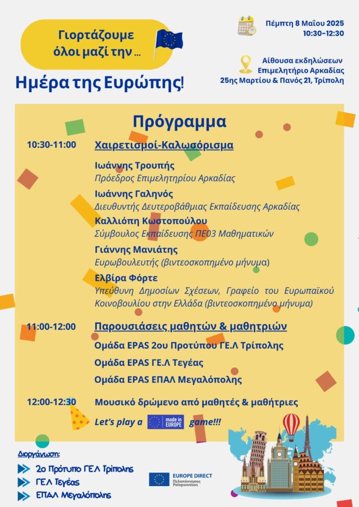 Οι ομάδες μαθητών και μαθητριών που συμμετέχουν στο «Πρόγραμμα Σχολεία Πρέσβεις του Ευρωπαϊκού Κοινοβουλίου» του 2ου Προτύπου ΓΕ.Λ Τρίπολης, του ΓΕ.Λ Τεγέας και του ΕΠΑΛ Μεγαλόπολης σε συνεργασία με το EUROPE DIRECT Πελοποννήσου σας προσκαλούν να Γιορτάσουμε Όλοι Μαζί την Ημέρα της Ευρώπης την Πέμπτη 8 Μαΐου 2025 και ώρα 10:30 στην αίθουσα εκδηλώσεων του Επιμελητηρίου Αρκαδίας.