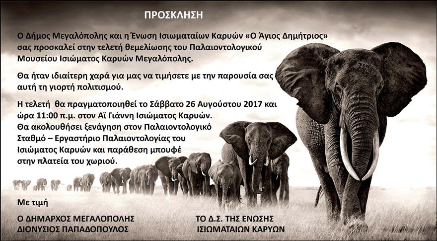 Το φως της προϊστορίας ακτινοβολεί ως σήμερα και θα λαμπρύνει για άλλη μια φορά την Ιερή των Αρκάδων Κορυφή, το Λύκαιο Όρος. Ταξίδεψε εκατομμύρια χρόνια για να ‘ρθει να ενωθεί με αυτό του Λύκαιου Δία, του Απόλλωνα, του Πάνα κ.ά, οι οποίοι λατρεύτηκαν και τιμήθηκαν σ’ αυτόν τον τόπο. Τελικά, θα εστιάσει στην περιοχή του Αϊ Γιάννη, όπου βρίσκεται το μικρό ξωκκλήσι του χωριού Ισιώματος Καρυών. Η ιστορία θα καταγράφει, παράλληλα, στις σελίδες της με ανεξίτηλο μελάνι την ημερομηνία: 26 Αυγούστου 2017. Ημέρα θεμελίωσης του Παλαιοντολογικού Μουσείου Μεγαλόπολης.