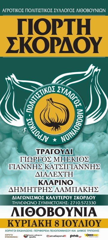 Ο Αγροτικός & Πολιτιστικός Σύλλογος Λιθοβουνίων σας προσκαλεί στη Γιορτή Σκόρδου, που διοργανώνει την Κυριακή 8 Ιουλίου 2018 στις 21:00, στην πλατεία του χωριού.