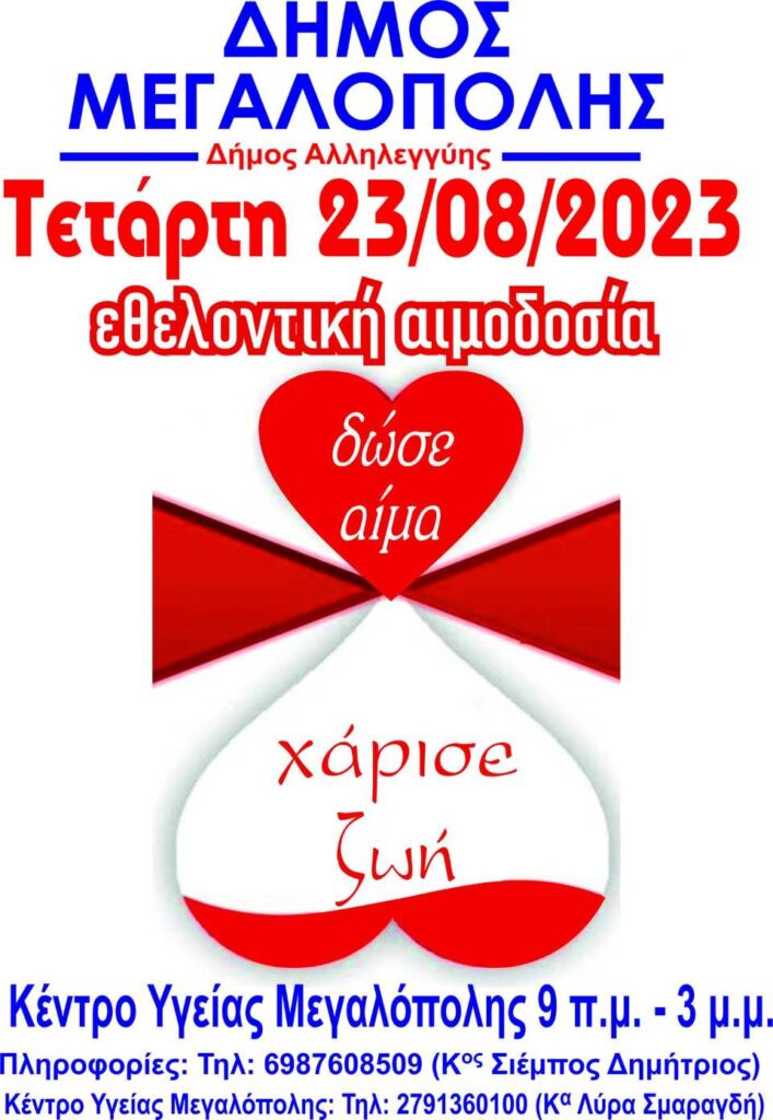 Καλούμε την Τετάρτη 23 Αυγούστου 2023 από τις 9.00 έως τις 15.00 στο χώρο του Κέντρου Υγείας Μεγαλόπολης, όλους τους εθελοντές αιμοδότες, συνδημότες μας και όχι μόνο, που έχουν τη δυνατότητα, να συμμετάσχουν ώστε να συνεχίσουμε να προσφέρουμε στους συνανθρώπους μας το μεγαλύτερο δώρο, το δώρο της ζωής.