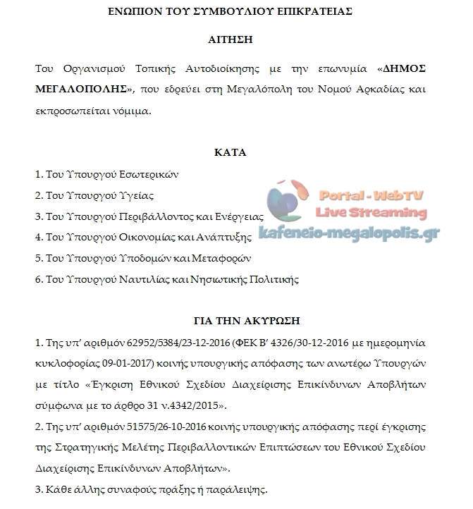 Κατατέθηκε από τον πληρεξούσιο δικηγόρο , η προσφυγή του Δήμου Μεγαλόπολης ενώπιον του Συμβουλίου της Επικρατείας , κατά της αριθμ. οικ.62952/5384/23-12-2016 ΚΥΑ«Έγκριση Εθνικού Σχεδίου Διαχείρισης Επικίνδυνων Αποβλήτων (ΕΣΔΕΑ) σύμφωνα με το άρθρο 31 του Ν 4342/2015».