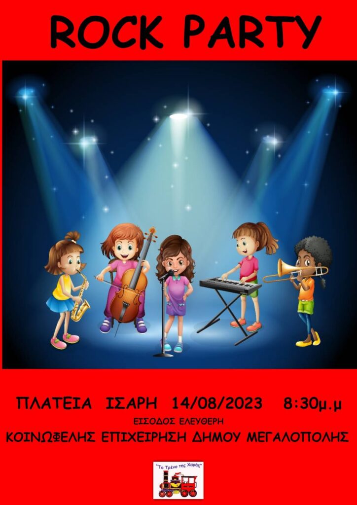 Ο Δήμος Μεγαλόπολης και η Δημοτική Κοινωφελής Επιχείρηση σας προσκαλούν στην παιδική εκδήλωση «Rock Party», από το «Τρένο της Χαράς», τη Δευτέρα 14 Αυγούστου 2023 στο Ίσαρη, στις 20:30.