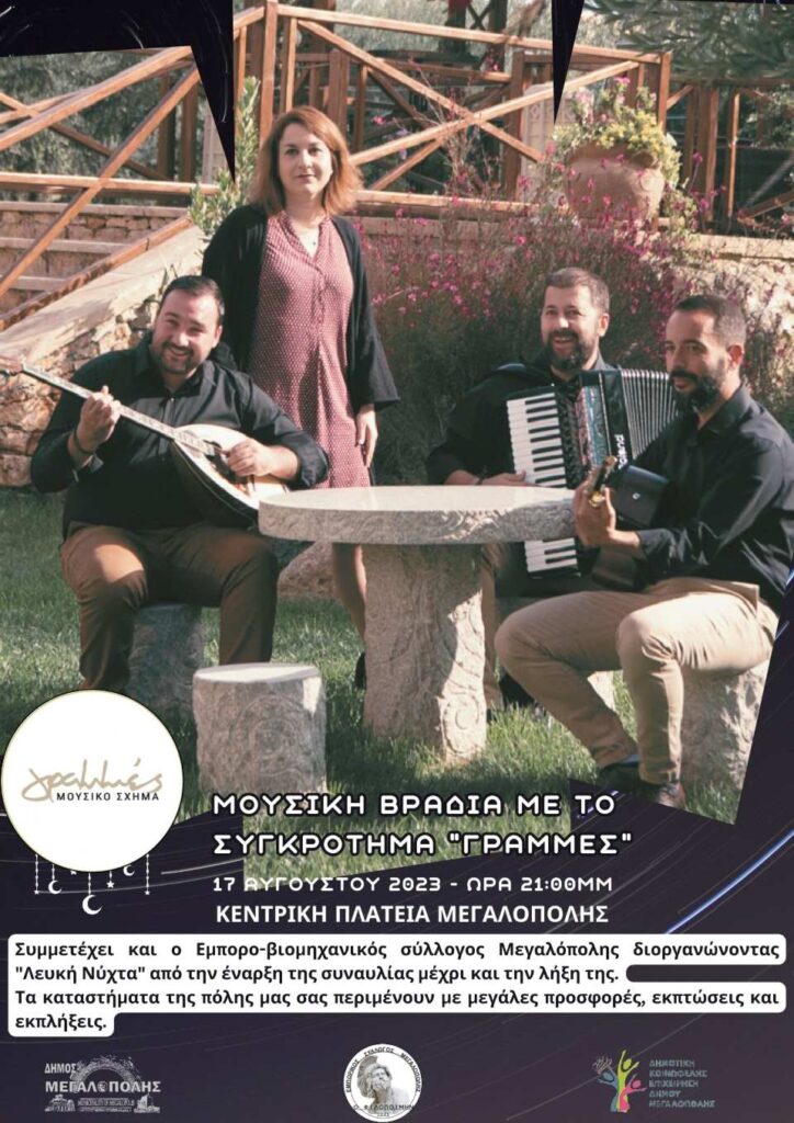 Ο Δήμος Μεγαλόπολης, η Δημοτική Κοινωφελής Επιχείρηση και ο Εμπορο-βιομηχανικός Σύλλογος Μεγαλόπολης, σας προσκαλούν στη συναυλία με το Μουσικό Σχήμα «Γραμμές» και στη Λευκή Νύχτα, την Πέμπτη 17 Αυγούστου 2023 στη Μεγαλόπολη από νωρίς το απόγευμα έως το βράδυ.