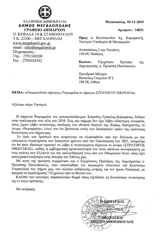 Παρατίθεται η σχετική επιστολή του Δημάρχου Μεγαλόπολης.