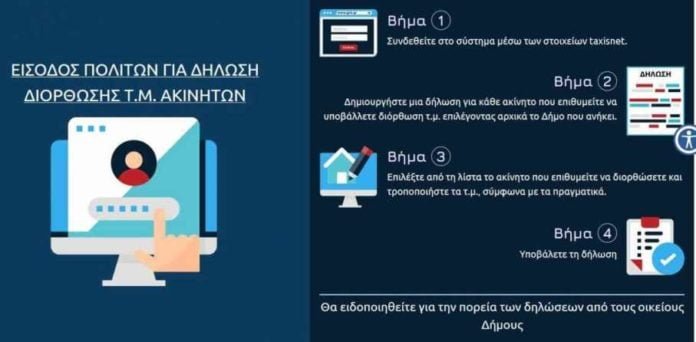 Ανακοινώνεται ότι, εφεξής όσοι πολίτες επιθυμούν να προβούν στη διόρθωση των στοιχείων των επιφανειών ακινήτων τους, μπορούν να επισκέπτονται από αύριο 27 Φεβρουαρίου 2020 την ηλεκτρονική πλατφόρμα δήλωσης τετραγωνικών μέτρων, που έχει δημιουργηθεί αποκλειστικά για αυτό το σκοπό από την Κεντρική Ένωση Δήμων Ελλάδος (ΚΕΔΕ), σε συνεργασία με το Υπουργείο Ψηφιακής Διακυβέρνησης, το Υπουργείο Εσωτερικών και τη Γενική Γραμματεία Πληροφοριακών Συστημάτων.