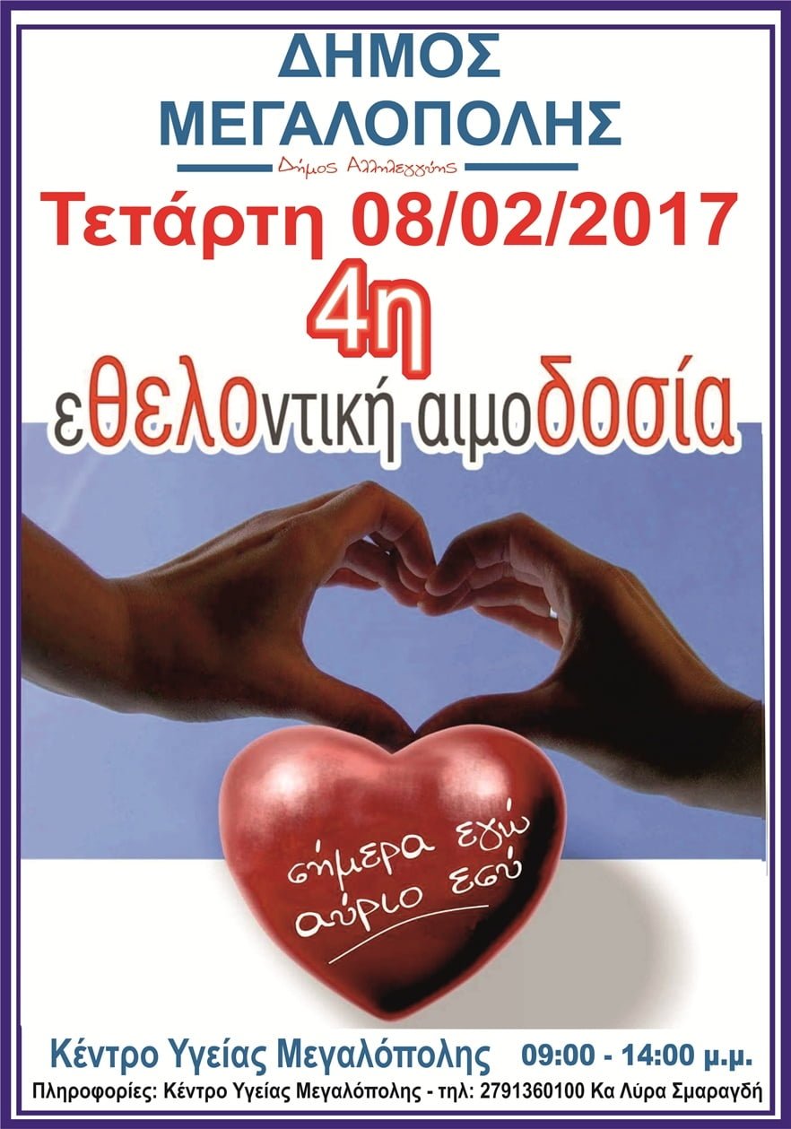 Ο Δήμος Μεγαλόπολης σε συνεργασία με το τμήμα Αιμοδοσίας του Παναρκαδικού νοσοκομείου και το Κέντρο Υγείας Μεγαλόπολης θα πραγματοποιήσει την Τετάρτη 8 Φεβρουαρίου από τις 9 π.μ. έως τις 2 μ.μ. την τέταρτη εθελοντική αιμοδοσία στο χώρο του Κέντρου Υγείας Μεγαλόπολης.