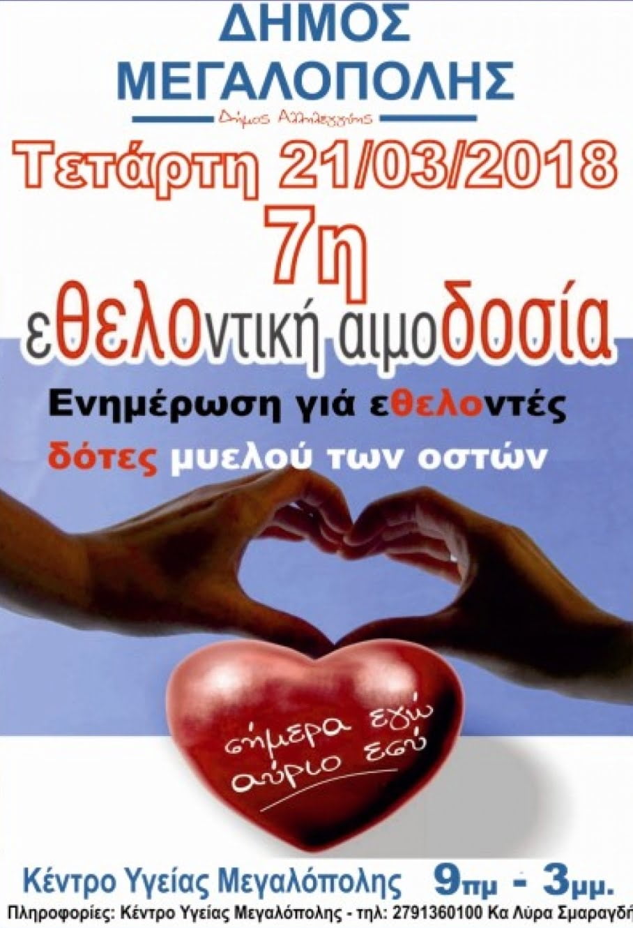 Ο Δήμος Μεγαλόπολης σε συνεργασία με το Τμήμα Αιμοδοσίας του Παναρκαδικού Νοσοκομείου και το Κέντρο Υγείας Μεγαλόπολης, θα πραγματοποιήσει την Τετάρτη, 21 Μαρτίου, από τις 9 π.μ. έως τις 15 μ.μ. την 7η εθελοντική αιμοδοσία στον χώρο του Κέντρου Υγείας Μεγαλόπολης.