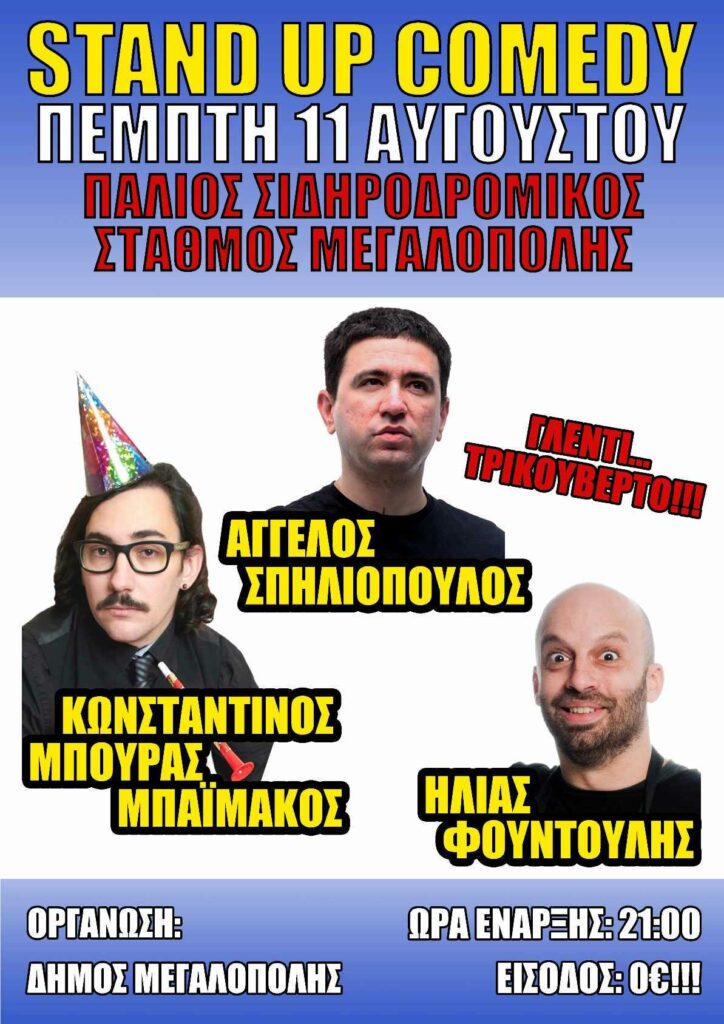 O Δήμος Μεγαλόπολης και η Κοινωφελής Επιχείρηση του Δήμου σας προσκαλούν στο Stand up Comedy με τους Ηλία Φουντούλη, Άγγελο Σπηλιόπουλο και Κωνσταντίνο Μπούρα – Μπαϊμάκο την Πέμπτη 11 Αυγούστου στον παλιό σιδηροδρομικού σταθμού στη Μεγαλόπολη στις 21:00.