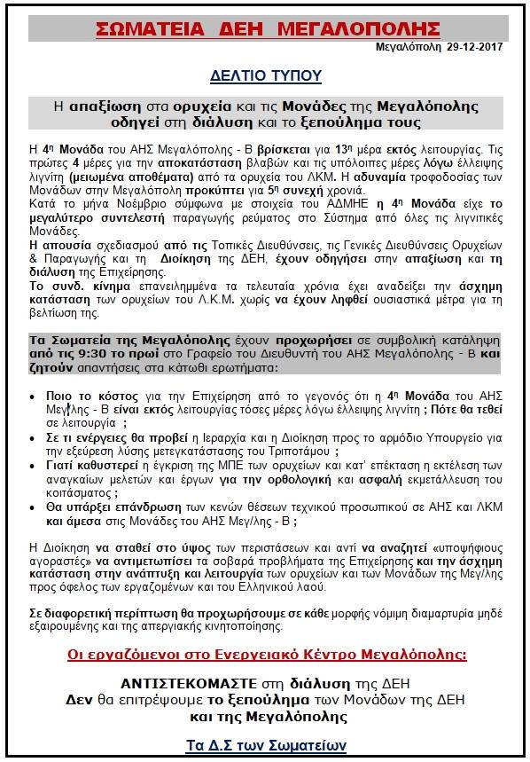 Παράλληλα συνδικαλιστές κάνουν παράσταση διαμαρτυρίας αυτή την ώρα στον ΑΗΣ Μεγαλόπολης Β΄, επειδή η μονάδα 4 βρίσκεται εκτός λειτουργίας αρκετές ημέρες, όπως υποστηρίζουν τα σωματεία η αιτία είναι  η έλλειψη λιγνίτη στις αποθήκες.