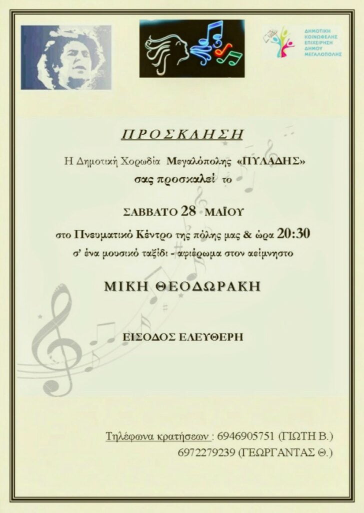 Το Σάββατο 28 Μαΐου θα γίνει η δεύτερη εκδήλωση από την Δημοτική χορωδία Μεγαλόπολης “ΠΥΛΑΔΗΣ”, στο Πνευματικό κέντρο Πολύβιος στις 20:30.