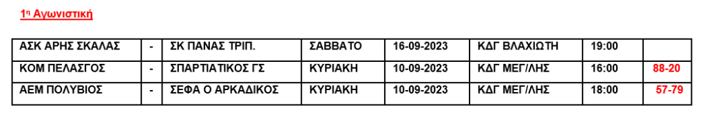Για το εφηβικό πρωτάθλημα  ο ¨ΠΕΛΑΣΓΟΣ¨ αγωνίστηκε στο κλειστό της Μεγαλόπολης με τον ¨Γ.Σ. ΣΠΑΡΤΙΑΤΙΚΟ ¨ και από το πρώτο λεπτό με πιεστική  άμυνα επέβαλε το δικό του ρυθμό στο παιχνίδι κάτι που φαίνεται και από το σκορ δεκαλέπτου (30-5).Στα ίδια επίπεδα  κύλησε και το δεύτερο δεκάλεπτο όπου παρά τις αλλαγές δεν έπεσε ο ρυθμός και το ημίχρονο έκλεισε με σκορ 55-10 .Στο δεύτερο ημίχρονο και ειδικά στο τέταρτο δεκάλεπτο υπήρξε χαλάρωση και ο αγώνας τέλειωσε με σκορ 88-20. Επόμενος αγώνας για την ομάδα της Μεγαλόπολης την Κυριακή στην Τρίπολη με τον ισχυρό και εφέτος  ¨ ΑΡΚΑΔΙΚΟ¨ σε ένα παιχνίδι που είναι ιδιαίτερα σημαντικό για την βαθμολογία.
