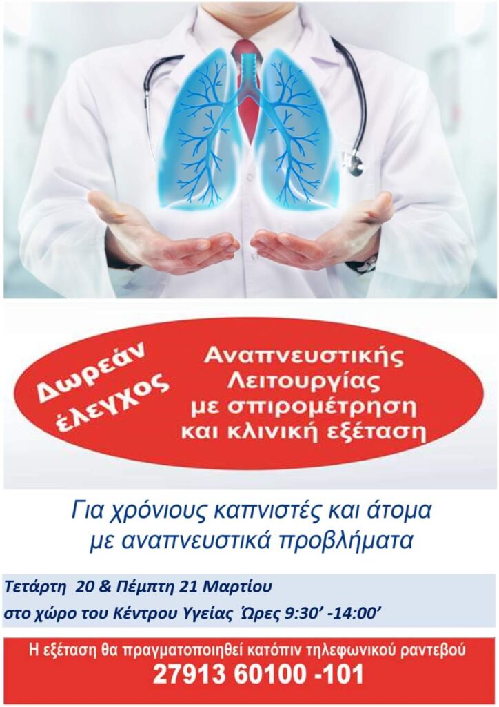Ο έλεγχος περιλαμβάνει κλινική εξέταση και σπιρομέτρηση και θα γίνει κατόπιν τηλεφωνικού ραντεβού στα τηλέφωνα 2791360100 – 101.
