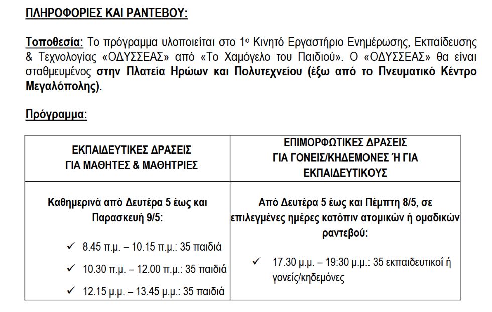 Στο Κινητό Εργαστήριο Ενημέρωσης, Εκπαίδευσης και Τεχνολογίας «ΟΔΥΣΣΕΑΣ» που θα βρίσκεται σταθμευμένο στην Πλατεία Ηρώων και Πολυτεχνείου (έξω από το Πνευματικό Κέντρο Μεγαλόπολης)