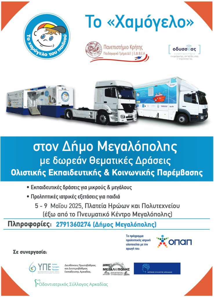Από τη Δευτέρα 5 έως και την Παρασκευή 9 Μαΐου 2025, «Το Χαμόγελο του Παιδιού» και το Εργαστήριο Προηγμένων Μαθησιακών Τεχνολογιών στη Δια Βίου και Εξ Αποστάσεως Εκπαίδευση (Ε.ΔΙ.Β.Ε.Α) του Παιδαγωγικού Τμήματος Δ.Ε. του Πανεπιστημίου Κρήτης θα βρίσκονται στον Δήμο Μεγαλόπολης, για να υλοποιήσουν από κοινού ένα Πολυήμερο με Δωρεάν Δράσεις Ολιστικής  Εκπαιδευτικής και Κοινωνικής Παρέμβασης για μικρούς και  μεγάλους, σε κρίσιμους τομείς που αφορούν τη ζωή και τα δικαιώματα των παιδιών.