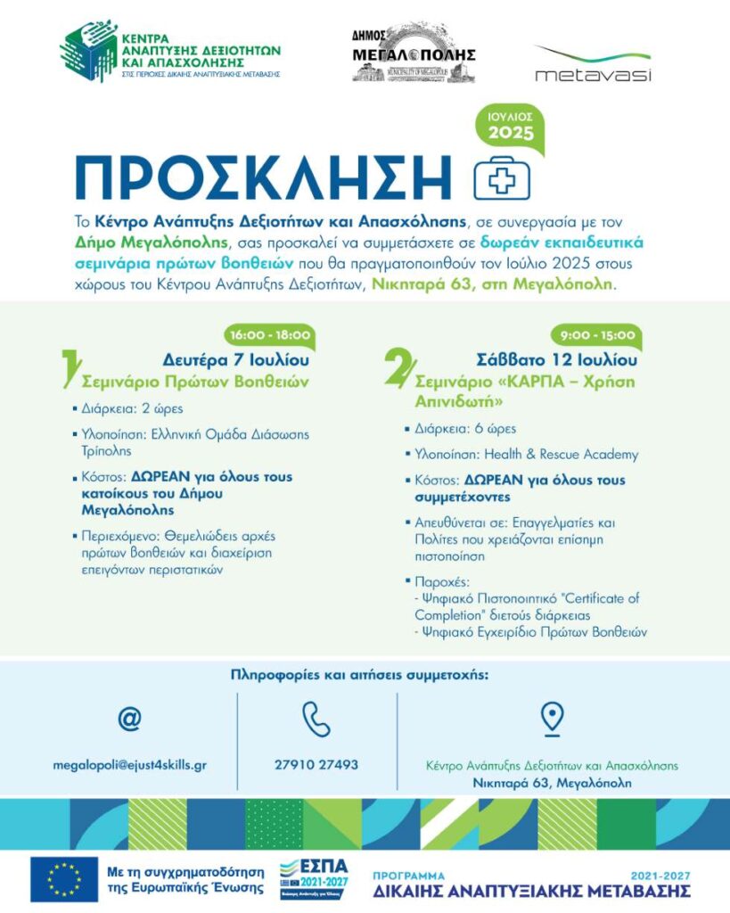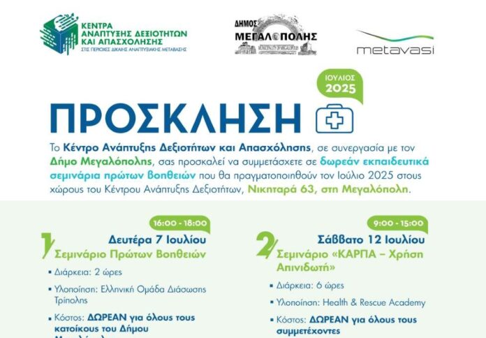 Το Κέντρο Ανάπτυξης Δεξιοτήτων και Απασχόλησης Μεγαλόπολης σε καλεί σε 2 σεμινάρια που μπορούν να σώσουν ζωές!