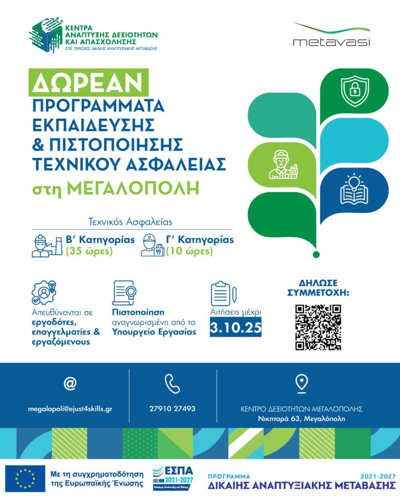 Τα Κέντρα Δεξιοτήτων Μεγαλόπολης ξεκίνησαν τη νέα δράση εκπαίδευσης και πιστοποίησης Τεχνικού Ασφαλείας, προσφέροντας σε επαγγελματίες και εργαζόμενους της περιοχής τη δυνατότητα να αποκτήσουν δωρεάν αναγνωρισμένα προσόντα, σύμφωνα με τη νομοθεσία (Ν. 3850/2010).
