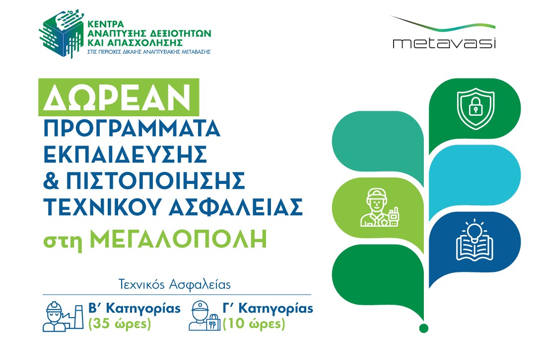 Τα Κέντρα Δεξιοτήτων Μεγαλόπολης ξεκίνησαν τη νέα δράση εκπαίδευσης και πιστοποίησης Τεχνικού Ασφαλείας, προσφέροντας σε επαγγελματίες και εργαζόμενους της περιοχής τη δυνατότητα να αποκτήσουν δωρεάν αναγνωρισμένα προσόντα, σύμφωνα με τη νομοθεσία (Ν. 3850/2010).