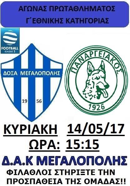 Την Κυριακή 14 Μαΐου η Δόξα Μεγαλόπολης υποδέχεται τον Παναργειακό στο τελευταίο εντός έδρας αγώνα για φέτος. Ο αγώνας ξεκινάει στις 15:15.