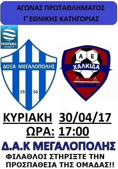 Την Κυριακή 30 Απριλίου η Δόξα Μεγαλόπολης υποδέχεται στην έδρα της , την ομάδα της Χαλκίδας.Το παιχνίδι είναι από τα πιο σημαντικά για την Δόξα αφού χρειάζεται τους βαθμούς για την παραμονή της στην Γ΄Εθνική.