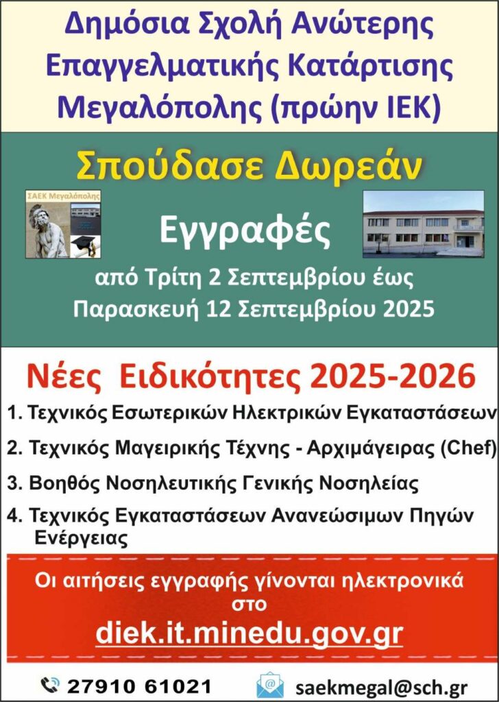 Οι απόφοιτοι δευτεροβάθμιας εκπαίδευσης, χωρίς ηλικιακό όριο, μπορούν να υποβάλλουν αίτησή για να εγγραφούν στο Α’ εξάμηνο των νέων ειδικοτήτων της ΣΑΕΚ Μεγαλόπολης (πρώην ΙΕΚ) για το έτος 2025-2026 από την Τρίτη 02 Σεπτεμβρίου μέχρι και την Παρασκευή 12 Σεπτεμβρίου 2025, ώρα 15:00. Η αίτηση υποβάλλεται μόνο ηλεκτρονικά στον σύνδεσμο: