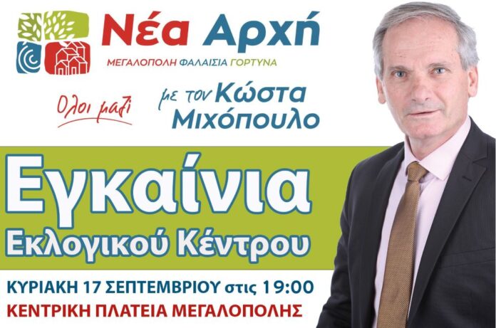 Σας προσκαλούμε στα εγκαίνια του εκλογικού κέντρου και την παρουσίαση των υποψηφίων του συνδυασμού ΝΕΑ ΑΡΧΗ , του υποψήφιου Δημάρχου Μεγαλόπολης Κώστα Μιχόπουλου, που θα γίνουν την Κυριακή 17 Σεπτεμβρίου στις 19:00 , στην κεντρική πλατεία Μεγαλόπολης.