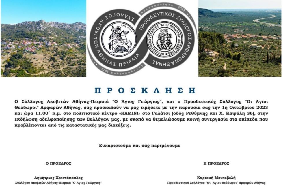 Ο Σύλλογος Ακοβιτών Αθήνας-Πειραιά “Ο Άγιος Γεώργιος” και ο Προοδευτικός Σύλλογος Αρφαρών Αθήνας “Οι Άγιοι Θεόδωροι”, σας προκαλούν να τιμήσετε με την παρουσία σας την εκδήλωση αδελφοποίησης των συλλόγων.