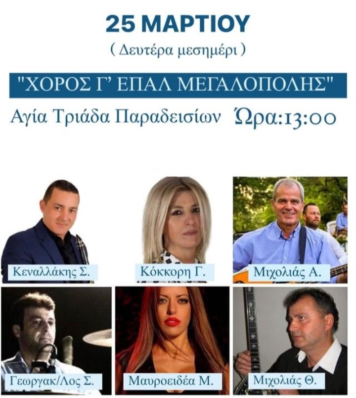 Η Γ΄τάξη του Επαγγελματικού Λυκείου Μεγαλόπολης διοργανώνει τον ετήσιο χορό της την Δευτέρα 25 Μαρτίου και ώρα 13:00 στην Αγία Τριάδα Παραδεισίων.
