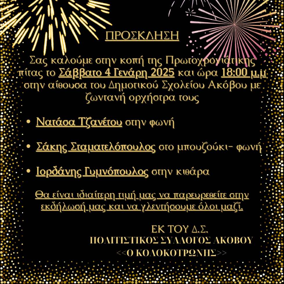 Σας περιμένουμε όλους για να γιορτάσουμε το Σάββατο 4 Ιανουαρίου 2025 και ώρα 18:00μ.μ