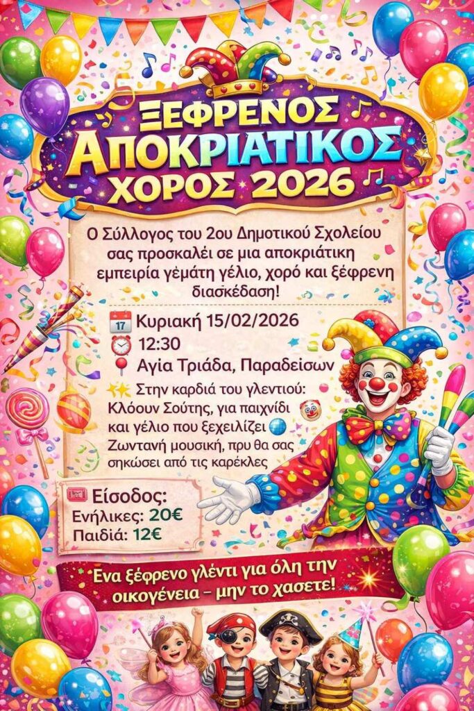Ο Σύλλογος Γονέων Κηδεμόνων 2ου Δημοτικού Σχολείου Μεγαλόπολης διοργανώνει εκδήλωση την Κυριακή 15 Φεβρουαρίου στην Αγία Τριάδα Παραδεισίων.