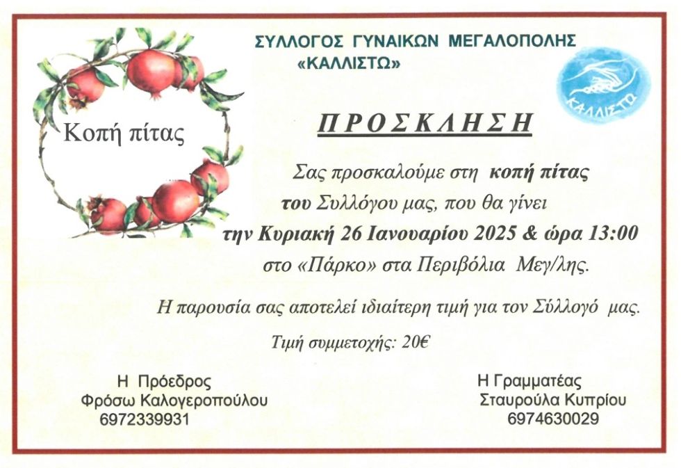 Σας προσκαλούμε να ευχηθούμε για την καινούρια χρονιά μαζί την Κυριακή 26 Ιανουαρίου 2025 και ώρα 13:00 στο «Πάρκο» στα Περιβόλια Μεγαλόπολης. Η παρουσία σας αποτελεί ιδιαίτερη τιμή για τον Σύλλογό μας.