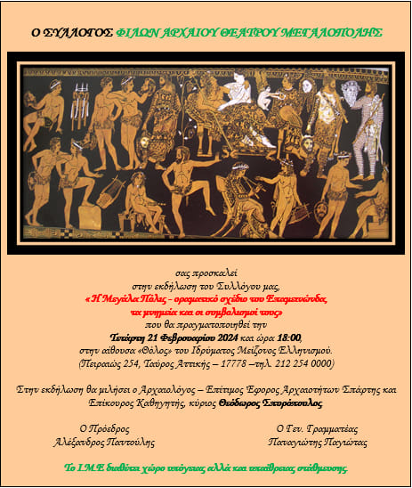 Ο Σύλλογος Φίλων Αρχαίου Θεάτρου Μεγαλόπολης διοργανώνει την Τετάρτη 21 Φεβρουαρίου 2024 στο Ίδρυμα Μείζονος Ελληνισμού εκδήλωση – παρουσίαση για το Αρχαίο Θέατρο Μεγαλόπολης με θέμα « Η Μεγάλα Πόλις – οραματικό σχέδιο του Επαμεινώνδα, τα μνημεία και οι συμβολισμοί τους»