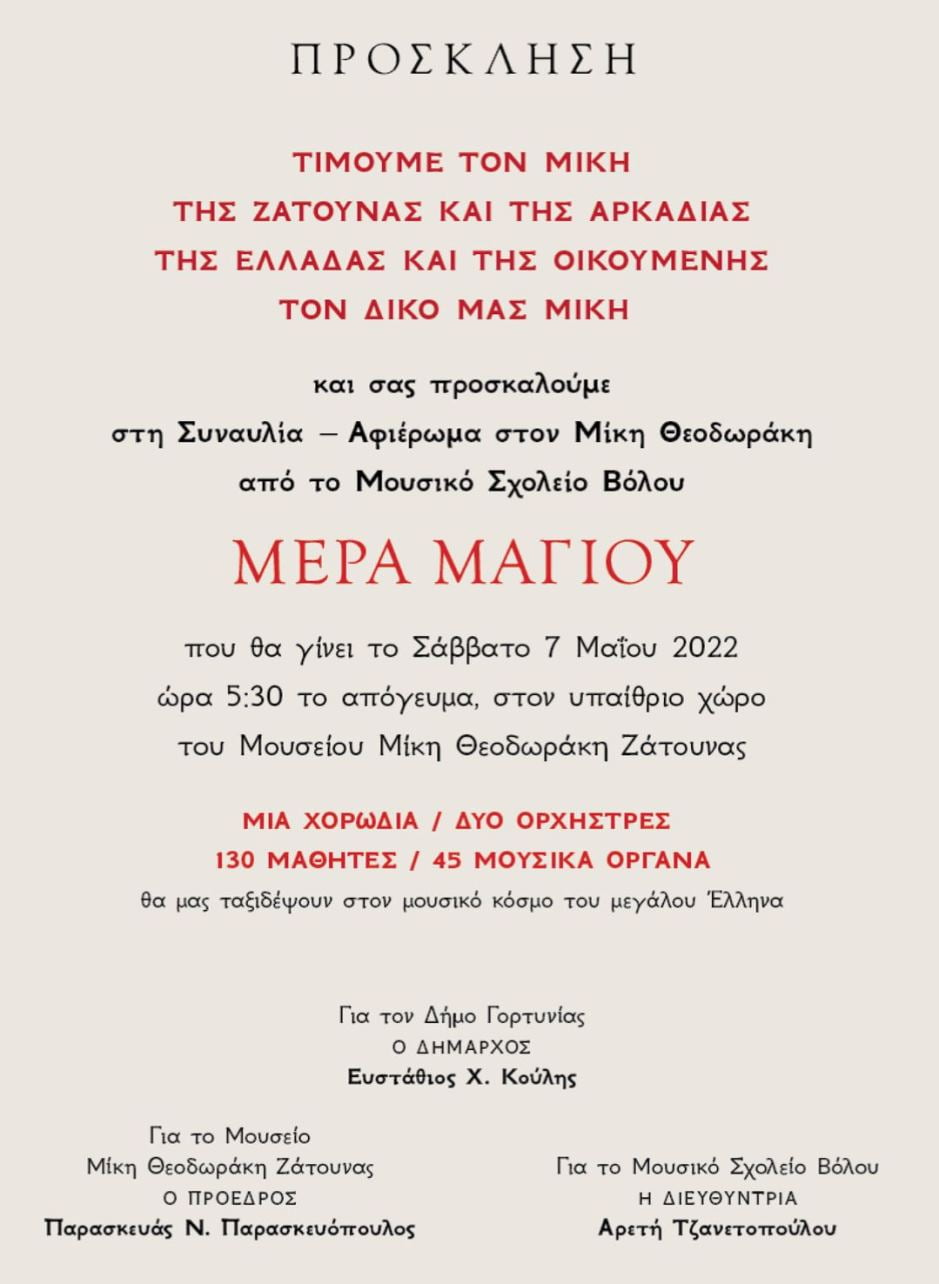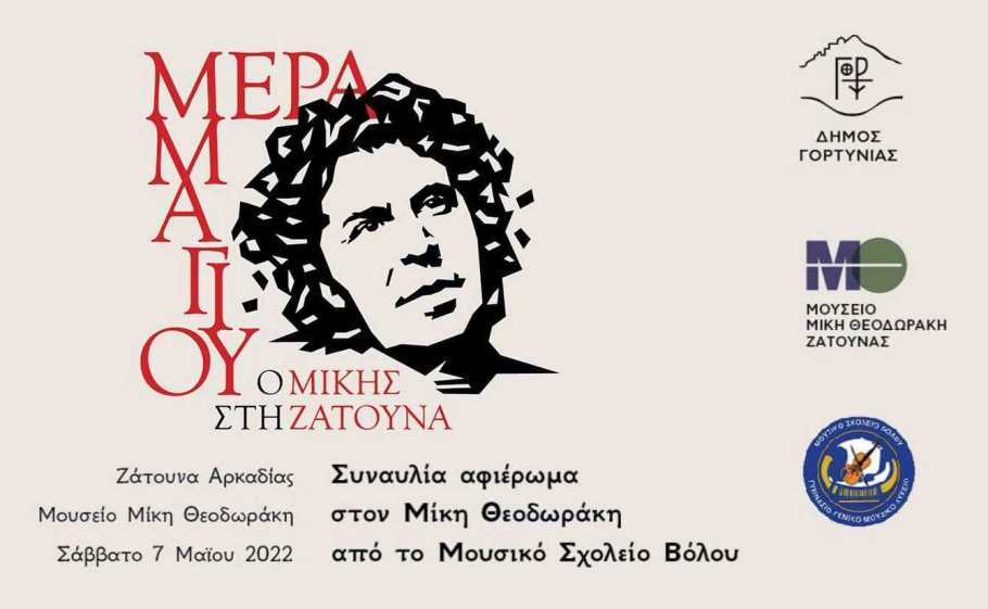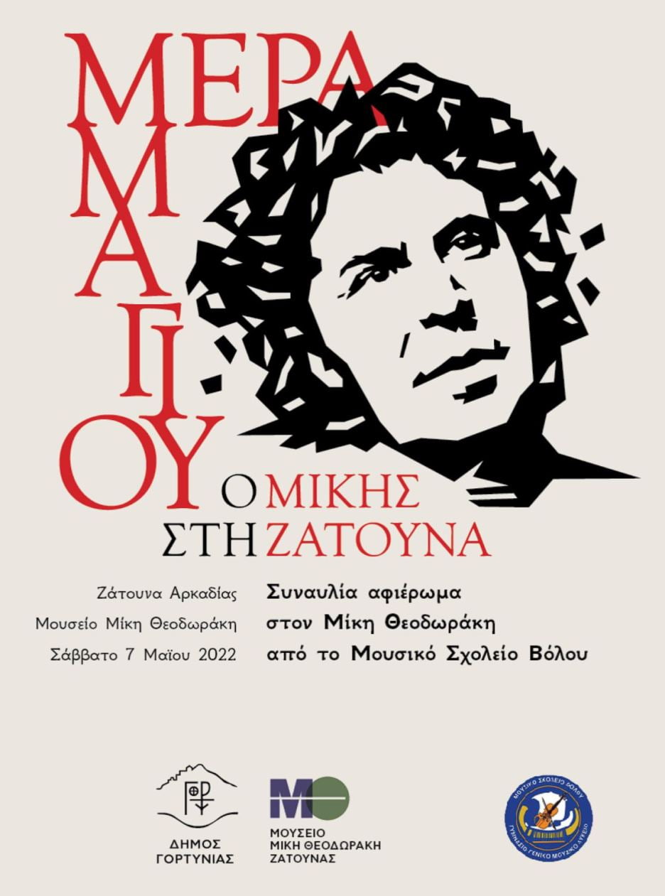 Μέρα Μαγιού με τον Μίκη Θεοδωράκη, στη Ζάτουνα, οργανώνει το Μουσείο Μίκη Θεοδωράκη Ζάτουνας, ο δήμος Γορτυνίας και το Μουσικό Σχολείο Βόλου, το Σάββατο 7 Μαΐου 2022, στις 5.30 το απόγευμα, στον υπαίθριο, μπροστά από το Μουσείο, χώρο.