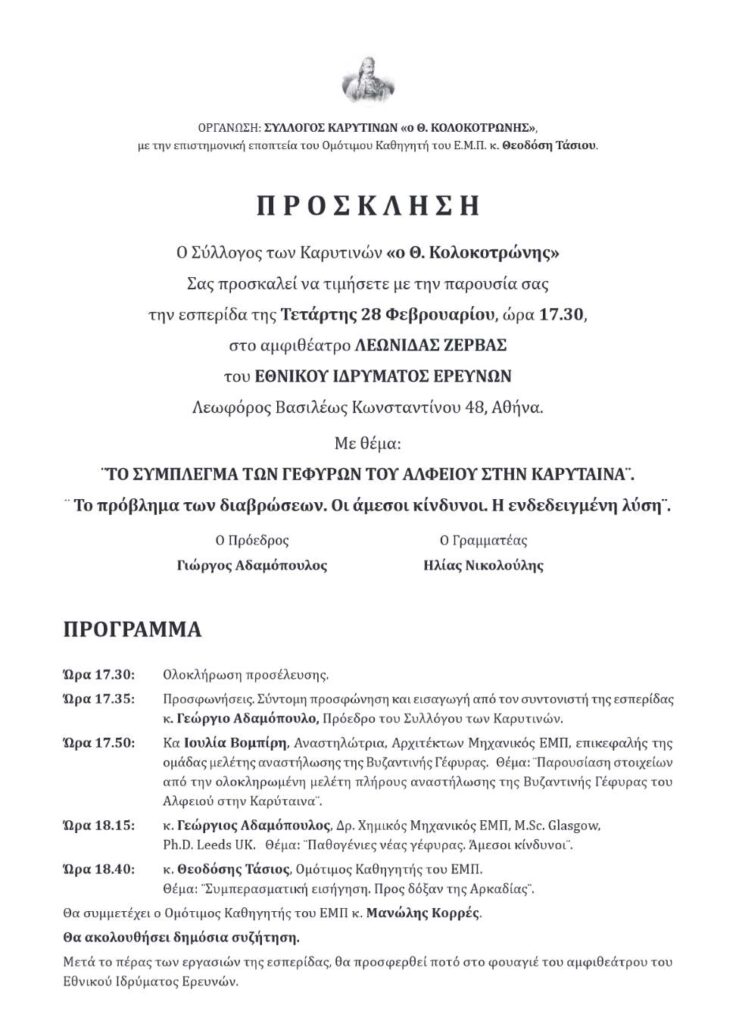 Θα είναι ιδιαίτερη τιμή μας η παρουσία σας στην εσπερίδα την οποίαν διοργανώνει ο Σύλλογος των Καρυτινών «ο Θ. Κολοκοτρώνης» την Τετάρτη 28 Φεβρουαρίου και ώρα 17.30, στο αμφιθέατρο Λεωνίδας Ζέρβας του Εθνικού Ιδρύματος Ερευνών, Λεωφόρος Βασιλέως Κωνσταντίνου 48, Αθήνα, στην προσπάθειά του να συμβάλλει στην έγκαιρη και ορθολογική αντιμετώπιση, από τις αρμόδιες αρχές, του εξαιρετικά δύσκολου και ιδιαίτερα σοβαρού προβλήματος, που αφορά στο «Σύμπλεγμα των γεφυρών του Αλφειού στην Καρύταινα».
