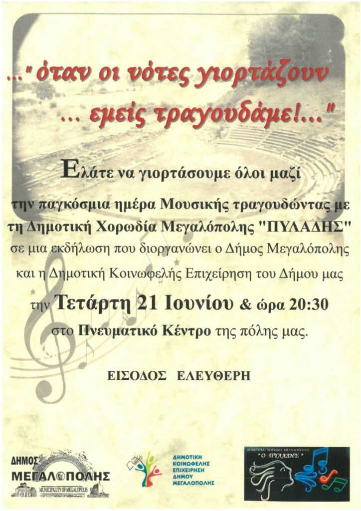 Ο Δήμος Μεγαλόπολης και η Δημοτική Κοινωφελής Επιχείρηση του Δήμου διοργανώνουν εκδήλωση για την παγκόσμια ημέρα μουσικής, την Τετάρτη 21 Ιουνίου και ώρα 20΅30 , στο Πνευματικό κέντρο Μεγαλόπολης “Ο Πολύβιος”.